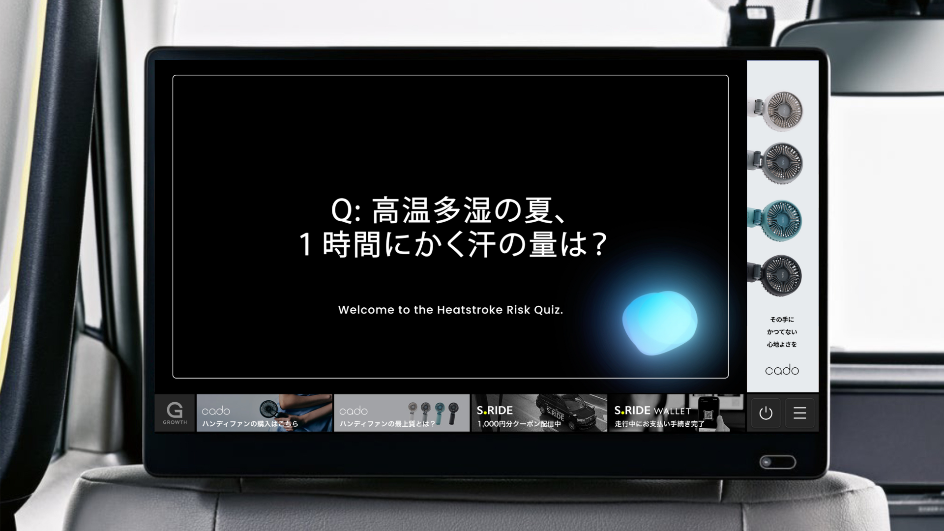 株式会社カドーは、夏の猛暑に“移動時間”を快適かつ有意義に変える体験型プロモーション「cadoの清涼タクシー」を展開しました。国際自動車・大和自動車交通の車両を中心とした都内100台のCanvas搭載タクシーにおいて、cado初のハンディファン「STREAM Mini」を自由に試せる仕掛けを実装。車内では、製品体験に加えて、熱中症のリスクをビジネスパーソンに啓発する「熱中症に関するクイズ形式のコンテンツ」も放映し、さらにQRコードからその場で商品購入も可能な設計としました。本タクシーは、タクシーアプリ「S.RIDE」による指定配車にも対応しており、移動の合間に“気になる製品を気軽に試せる、新しい行動体験を促す企画として注目を集めました。