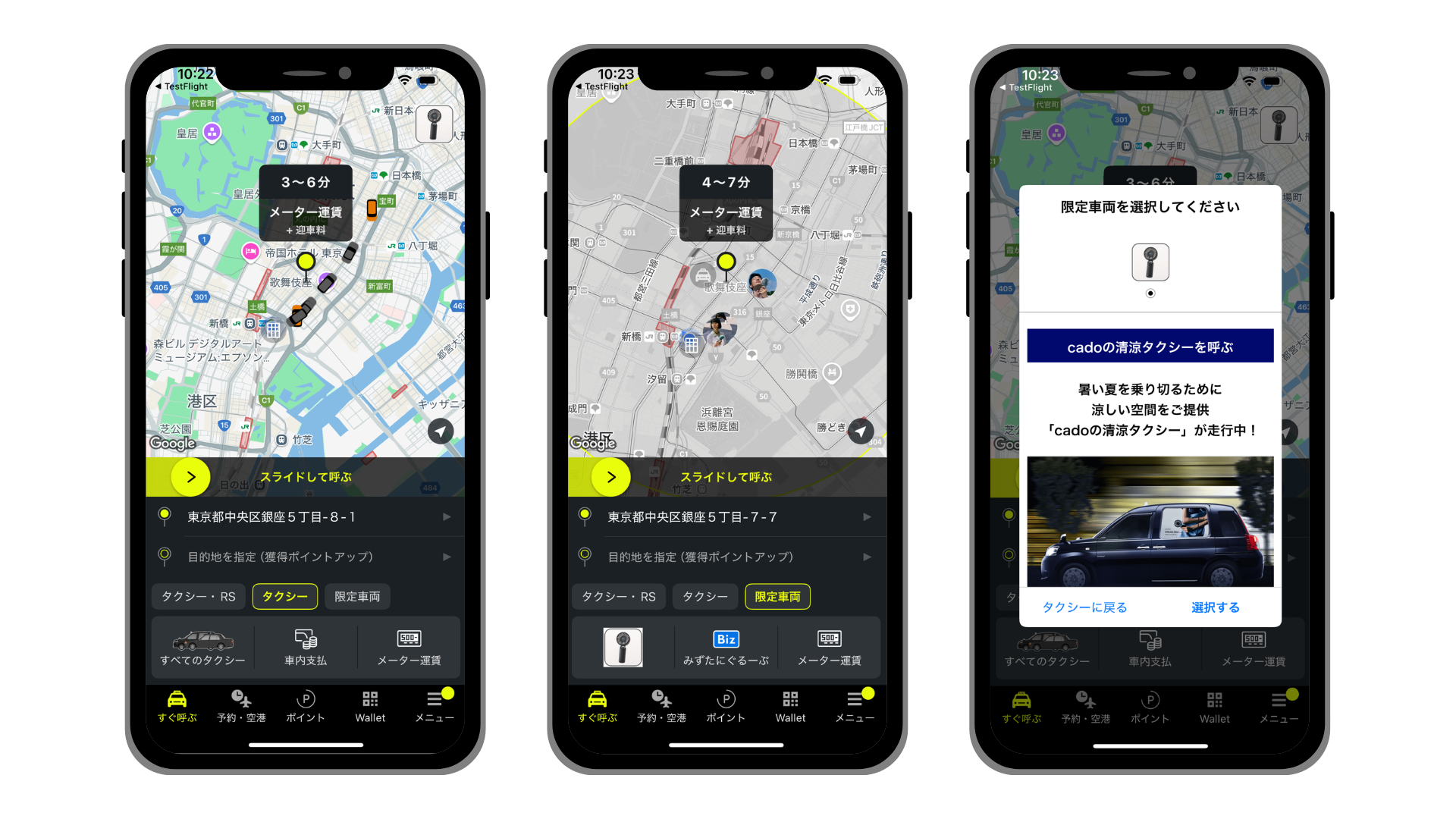 走行期間中「cadoの清涼タクシー」は、タクシーアプリ「S.RIDE」で指定配車が可能です。車窓のクリエイティブが「cadoの清涼タクシー」の目印に - 車内サイネージで「熱中症クイズ」や豆知識を放映